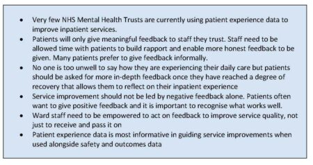 One of the important last points this report makes is about how to help make patient experience processes cost effective. The researchers undertook an economic assessment which showed that an investment in meaningful gathering of patient experience resulted in cost savings in relation to reduced rates of violence, faster discharge and improved staff morale. In other words, for the patient feedback processes to be cost effective it is vital that feedback is acted on in meaningful ways to enable change. Now is the time for all health and social care organisations to view gathering patient and staff experiences as an investment rather than a tick box exercise and for clinical teams to believe in the power of feedback and act on this. Demonstrating the value of the way we work will also provide powerful arguments for the key stakeholders in all these processes but especially the ones who hold the financial purse strings.