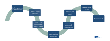 I work with a dedicated team of research nurses throughout Europe, and our role is to contact patients who have expressed an interest in research participation via the patient community platforms. We speak with many patients each day and provide support and information related to clinical trials. Some patients need signposting towards seeking help for management of their health condition, other patients want to tell their story of their health experiences, the majority of the patients are seeking information about health research to help determine if research participation is for them. Patients feel empowered to make their own decisions regarding research involvement following their self-referral and it is humbling for the research nurses to be part of this journey. The research nurses have contact with the research sites and sponsors of the research studies, but it is the unique relationship with patients that makes this role so special. The figure below depicts a typical patient and research nurse journey through the British Research Panel.