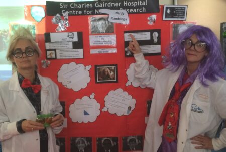 To celebrate all the great things that we do in nursing, Sir Charles Gairdner Hospital has for many years organised an annual fun event called ‘Nursing Extravaganza’. It is always held at the end of the year and nurses throughout the hospital are asked to showcase the innovative work that they do using displays. Ward nurses visit the Nursing Extravaganza and there are free ice creams. In 2015 the Centre for Nursing Research, where I work, decided to go with the mad professor theme. We all dressed up as Einstein look-a-likes and each of us had a nickname based on our area of research interest/expertise. I was named ‘Wilhelmina Wellbeing’ and I dressed up in a crazy purple wig, wacky glasses and white laboratory coat.