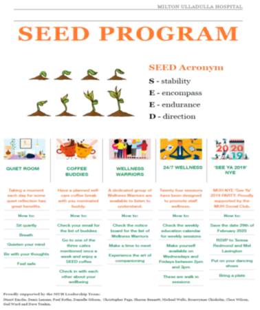 The SEED Program was based in a rural town on the south-east coast of NSW, Australia. SEED provided an opportunity to embed sustainable change for staff wellbeing across the Illawarra Shoalhaven Local Health District (ISLHD), by recognising that staff are the most knowledgeable about their own wellness. Staff in this context is all levels in the hospital, including cleaners, wards persons, allied health, nursing and medical staff. The SEED Program was developed in Milton Ulladulla Hospital (MUH) in the aftermath of the 2019 – 2020 Australian bushfire disaster. A Participatory Action Methodology was used with staff to create the wellbeing program, encompassing five staff led initiatives that promoted healing, wellness, belonging and connection. The name SEED creatively evolved, standing for the true essence of what frontline staff needed at the time: Stability, Encompassing, Endurance and Direction