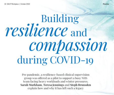 Building Resilience and Compassion during Covid 19, by Sarah Markham, Teresa Jennings and Steph Brunsden, explores their experiences of undertaking Resilience-based Clinical Supervision and its benefits. ‘The group reflected that the model made intuitive sense and felt both natural and organic. It provided a much-needed restorative element, so often missing from supervision, and it was suggested that all staff could benefit from RBCS.’