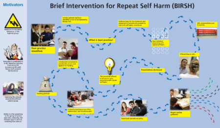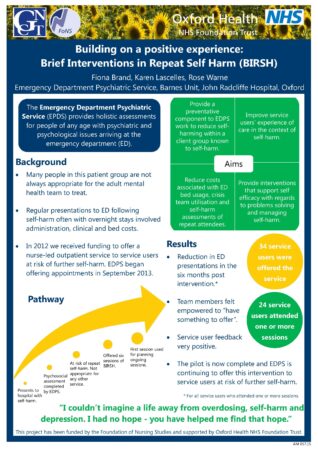 This project built on a positive experience within a self harm team, of providing increased support to a service user who was frequently self harming. In collaboration with wider professional and service users, a team of nurses in Oxford have developed, implemented and evaluated a clinic to provide preventative and proactive support to people who frequently present at A&E following self harm and who are not currently receiving support from any services. Using an action research approach enabled the team to conduct a 12 month pilot of the clinic, developing the clinic in an ongoing way in response to discussions within the regular group supervision meetings for team members and with the project steering group.