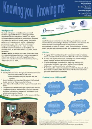 To re-develop the way we gather and record resident information/data. We wanted to achieve a person-centred approach to collecting the information and to generate knowledge by participating in the older person’s (resident’s) life world, creating a collaboration between the older person and the carers. Ultimately we are trying to achieve a ‘home from home’ for our residents where they feel safe, supported and able to express their individuality.